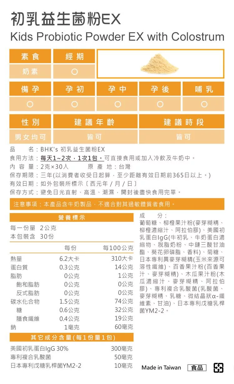 成 分:葡萄糖、柳橙果汁粉(麥芽糊精、柳橙濃縮汁、阿拉伯膠)、美國初乳蛋白IgG(牛初乳、牛奶蛋白濃縮物、脫脂奶粉、中鏈三酸甘油酯、葵花卵磷脂、香料)、菊糖、日本專利異麥芽糊精(玉米來源可溶性纖維)、百香果汁粉(百香果汁、麥芽糊精)、木瓜果汁粉(木瓜濃縮汁、麥芽糊精、阿拉伯膠)、專利複合乳酸菌(乳酸菌、麥芽糊精、乳糖、微結晶狀α-纖維素、甘油)、日本專利戊糖乳桿菌YM2-2。