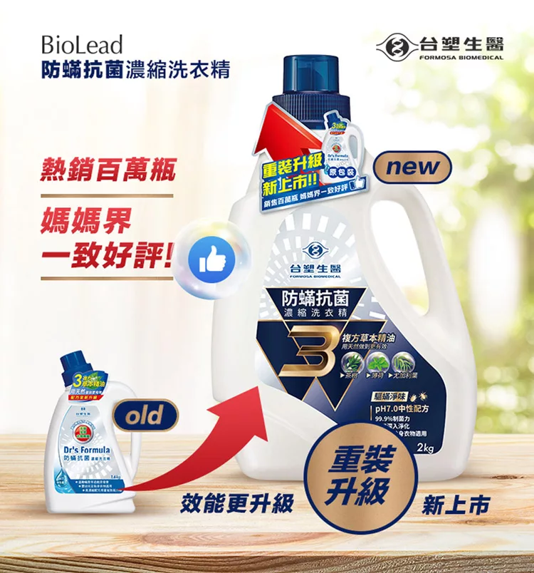 《台塑生醫》Biolead防蹣抗菌濃縮洗衣精(2kgx3瓶+補充包1.5kgx6包)