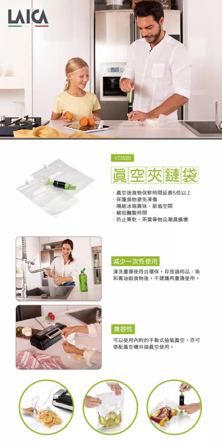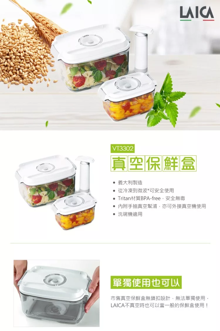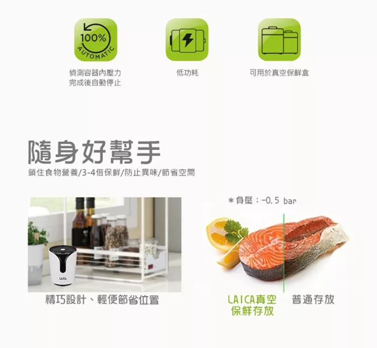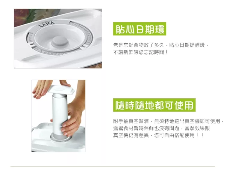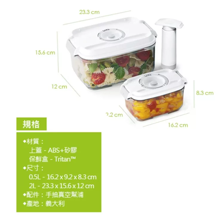 | 【隨身電子真空機】 材質:ABS、矽膠 預設真空壓力:-0.5 bar 抽氣速度:4L/分 功率:3W 電池規格:1.5V AA鹼性電池(3號) x4 (未含在包裝內) 尺寸: 7*7*8.5 cm 產地:中國 保固:1年 內容物:手持式真空器、真空轉接頭3種 【真空保鮮盒】 規格:0.5L 2L 材質:蓋子-ABS+矽膠 盒子-Tritan 產地:義大利 【可重複利用真空夾鏈袋】 材質:PA+PE 規格:22x34 5個、26x34 5個、手抽幫浦*1 |