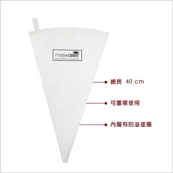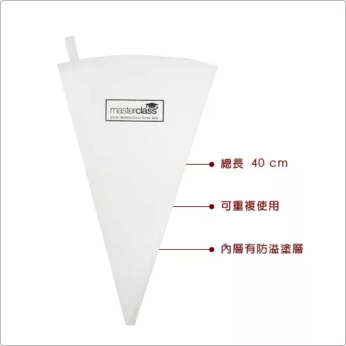本商品一件入(可吊掛)、適用手洗清潔。大容量擠花袋,可裝入各式奶油、巧克力醬、馬鈴薯泥,讓您輕鬆完成泡芙內餡充填、甜點擠花或鹹派的擠料與裝飾。手感柔軟的袋身以棉製成,內層有防溢塗層,確保醬料不會滲到外袋,是烘焙料理時的必備推薦。可裁剪,方便您調整擠花口的大小。好清洗可重複使用,也減少對資源的浪費。