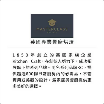 1850 年創立的英國家族企業 Kitchen Craft,在創始人努力下,成功拓展旗下的系列品牌。專為料理高手與烘焙行家打造的品牌 Master Class,推出多元進階版餐廚用品,讓使用率高的消費者也能得心應手,為家居與餐廚提供更多美好的選擇。