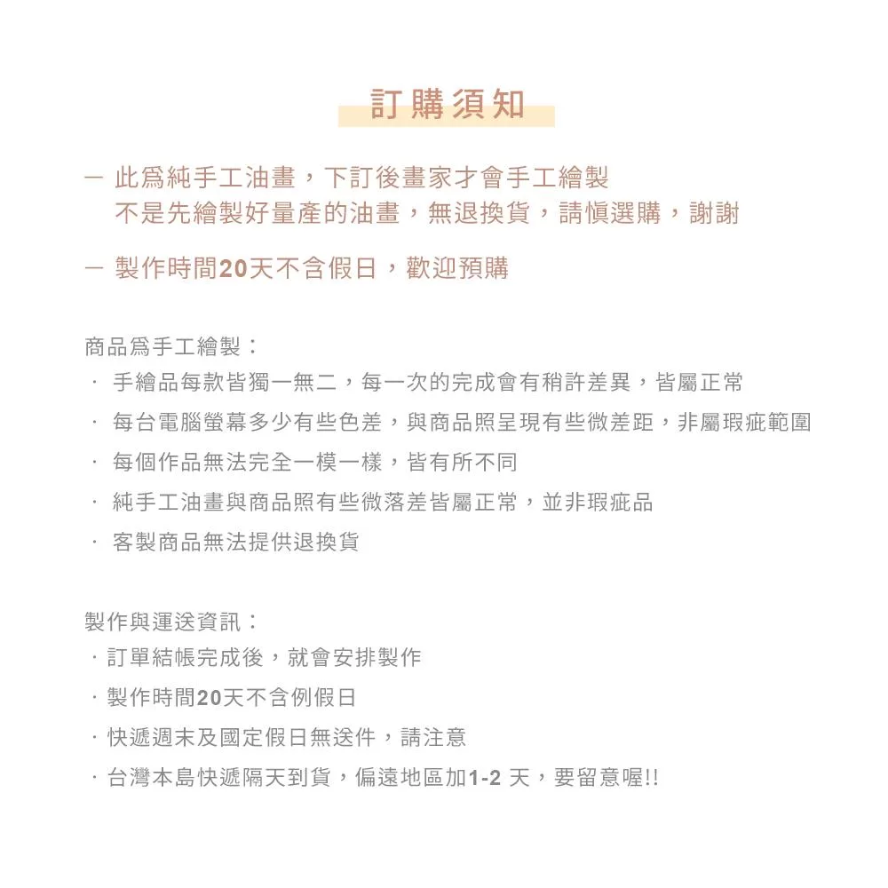 •此為純手工油畫,下訂後畫家才會手工繪製,不是先繪製好量產的油畫,無退換貨,請慎選購