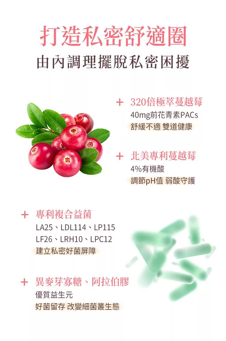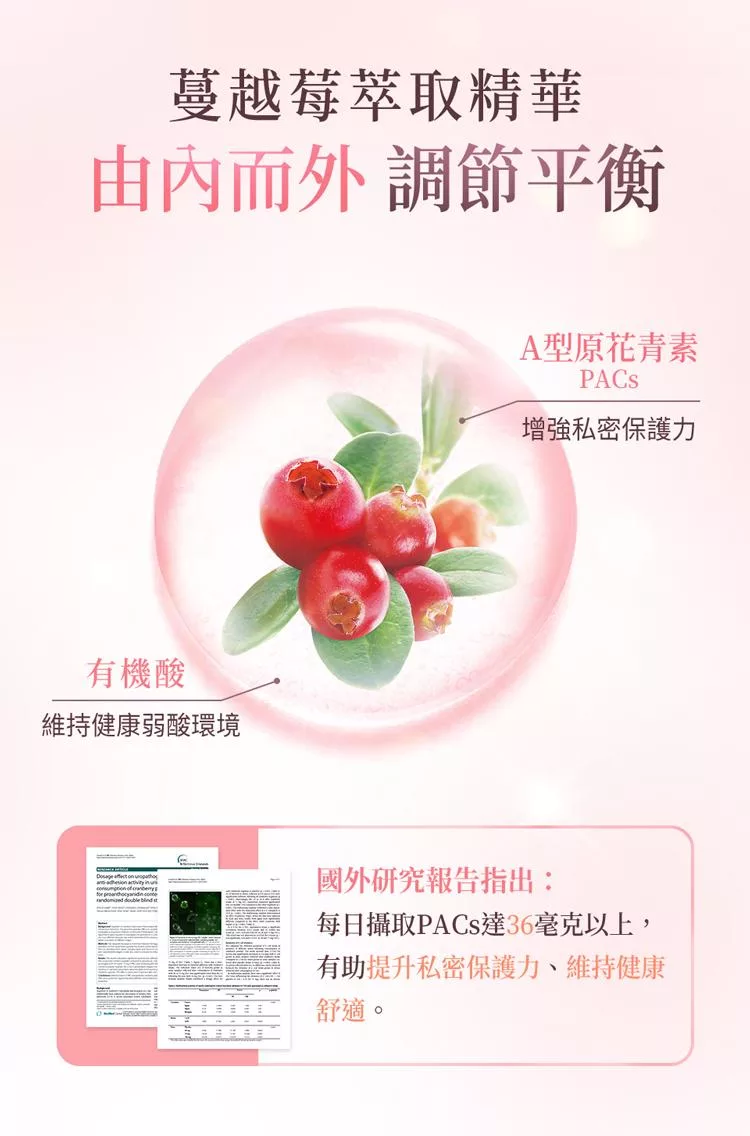 高規定量A型前花青素40毫克及4%有機酸,有助於舒緩不適,提升私密保護力。