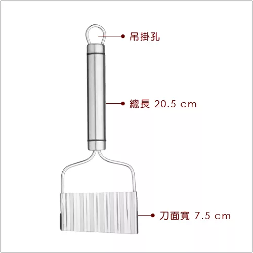 將馬鈴薯、紅蘿蔔、黃瓜等食材切成波浪片狀,讓擺盤裝飾更富巧思,也令家中小朋友更喜愛食用蔬果。此款切刀亦適合切片豆腐、起司、火腿、香菇等;可吊掛收納不佔空間。