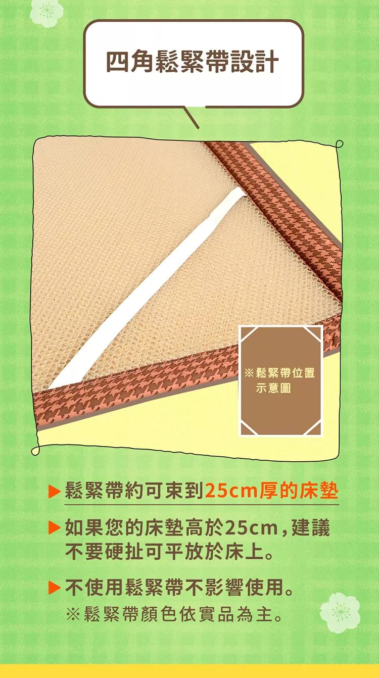 注意事項 : 鬆緊帶約可束到23cm,如果您的床墊高於23cm,請不要硬扯,也可平放於床上;不束鬆緊帶不影響使用喔 !