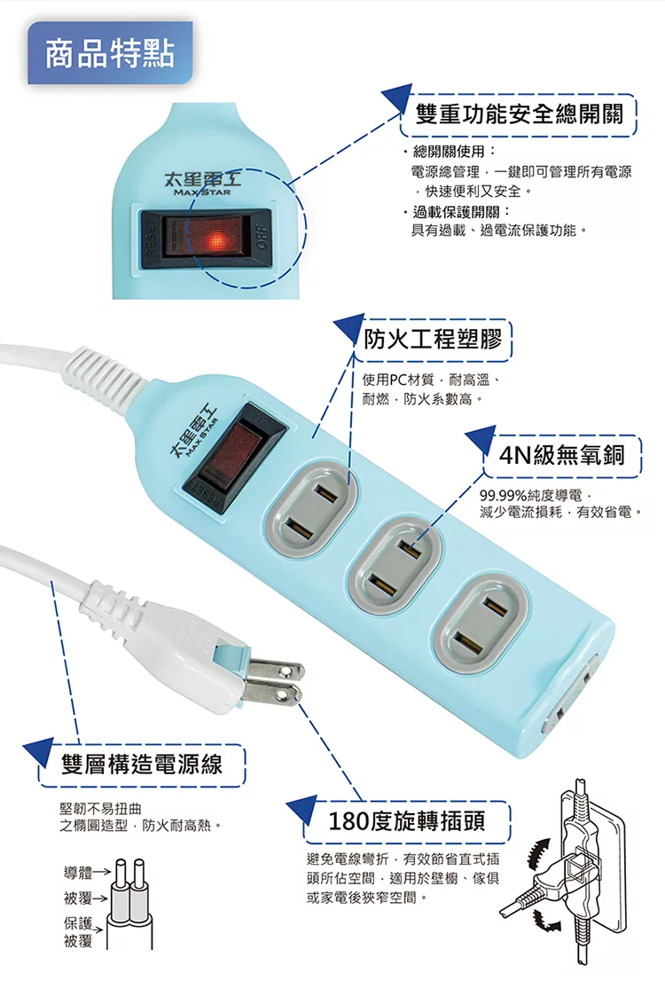 4.雙層構造電源線:堅韌不易扭曲之橢圓造型,防火耐高熱。