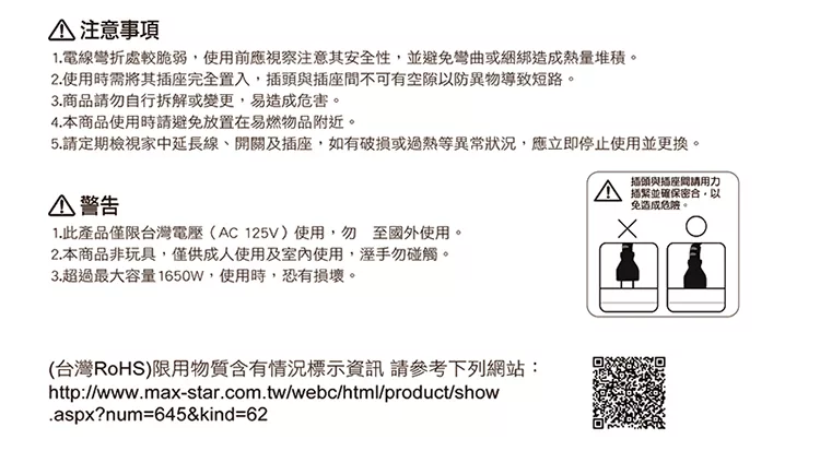 (使用中若超過最大容量負荷,過載保護開關即會彈起,此時請將不需要的電器插頭拔除,