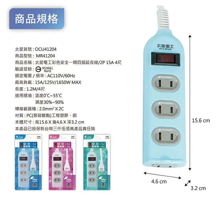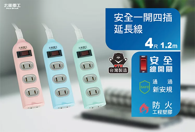 【太星電工】 一開四插延長線/2P 15A 4尺 總開關 過載保護 OEA41204 白色