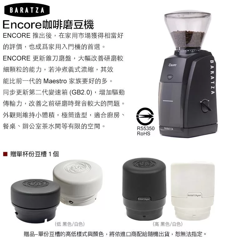 變速箱 Gearbox-從2012年開始,Baratza 產品導入第二代變速箱 (GB 2.0),大幅增加驅動齒輪傳輸的強度和耐用性,同時降低噪音。更新變速箱包括軸承、電機固定板和齒輪,新的傳送齒輪由15%玻璃耐熱塑料填充製成,比之前的金屬齒輪安靜,更耐衝擊。在Encore嚴格測試下,把不銹鋼螺絲丟進磨盤,馬達、齒輪與磨盤都會立即停止運轉,刀盤都毫無損傷。