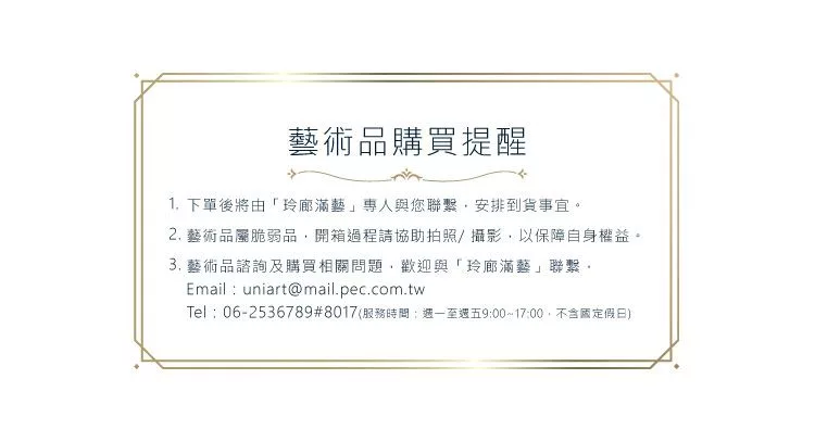 - 1藝術品下單後將由「玲廊滿藝」專人與您聯繫,安排到貨事宜。