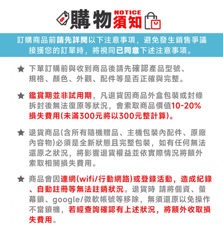 3.產品一經拆封、連線註冊後,均需額外收取退貨整新費用。