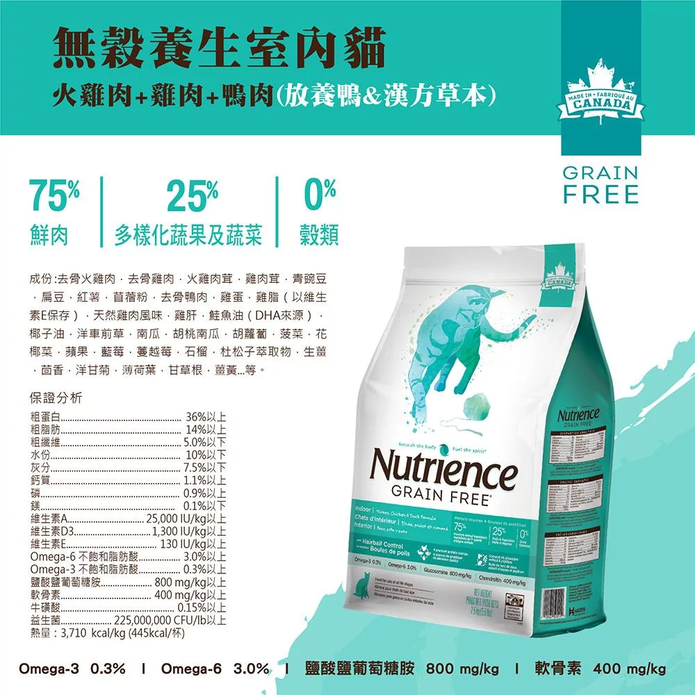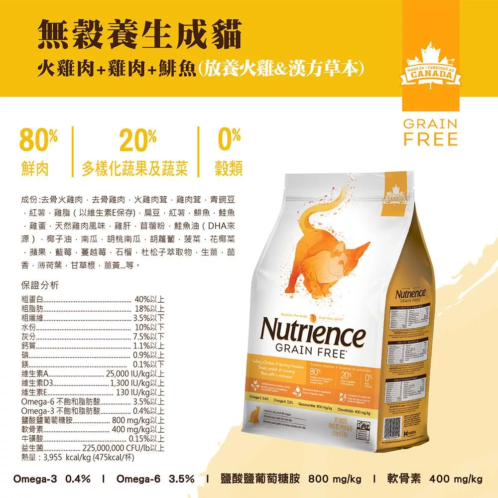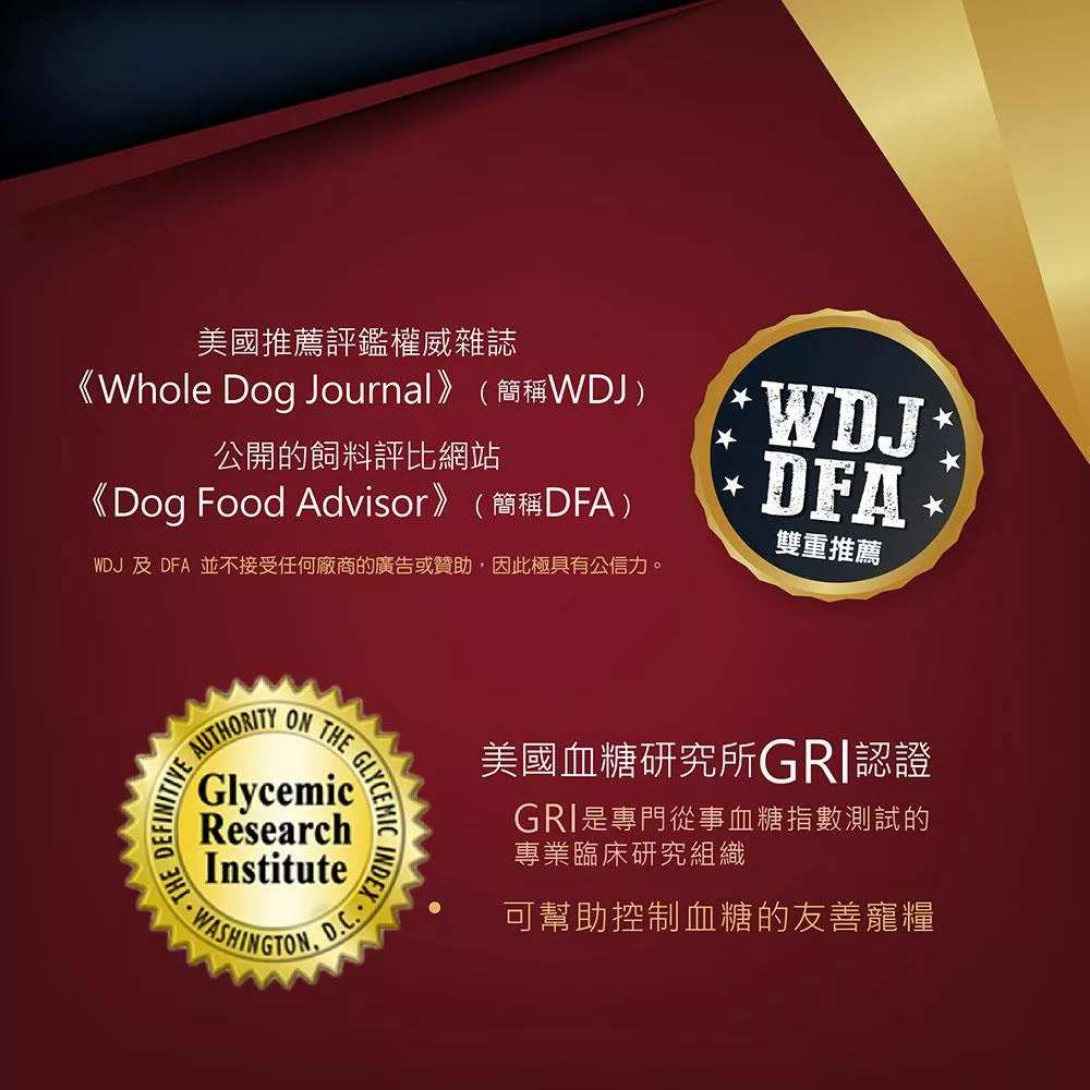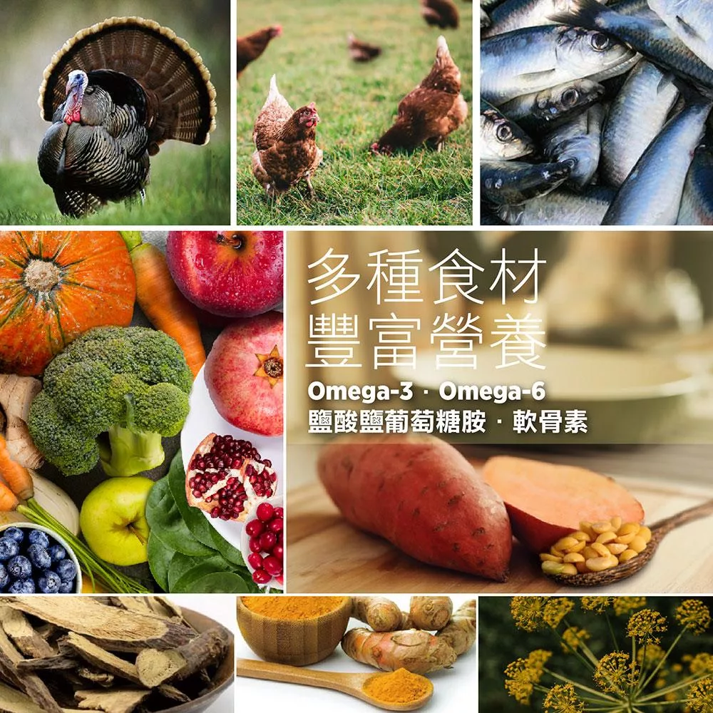 去骨火雞肉,去骨雞肉,火雞肉茸,雞肉茸,綠豌豆,扁豆,紅薯,曬乾苜蓿,去骨鴨肉,整顆雞蛋, 雞脂(以維生素E保鮮),天然雞肉風味,雞肝,鮭魚油(DHA來源),椰子油,洋車前子,南瓜, 胡桃南瓜,胡蘿蔔,菠菜,綠花椰菜,蘋果,藍莓,蔓越莓,石榴,杜松子萃取物,薑,茴香,洋甘菊, 薄荷葉,甘草根,薑黃,維生素(維生素E補充,維生素A補充,菸鹼酸(維生素B3),泛酸鈣(維生素B5), 核黃素(維生素B2),鹽酸吡哆醇(維生素B6),硫胺素(維生素B1),生物素(維生素H),維生素B12補充, 維生素D3補充,葉酸,礦物質(氧化鋅,蛋白質鋅,蛋白質鐵,硫酸亞鐵,蛋白質銅,硫酸銅, 蛋白質錳,氧化錳,碘酸鈣,亞硒酸鈉),鹽,DL-蛋氨酸,氯化膽鹼,卵磷脂,氯化鉀,牛磺酸, L-離氨酸,酵母萃取物,乾燥海藻,絲蘭萃取物,菊苣根萃取物,鹽酸鹽葡萄糖胺,軟骨素, 鳳梨萃取物,迷迭香萃取物,左旋肉鹼,嗜酸乳桿菌,凱氏乳桿菌,比菲德氏菌,腸球菌