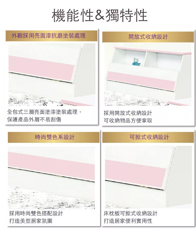 床頭箱為可掀式床枕板+內收納層格收納設計
