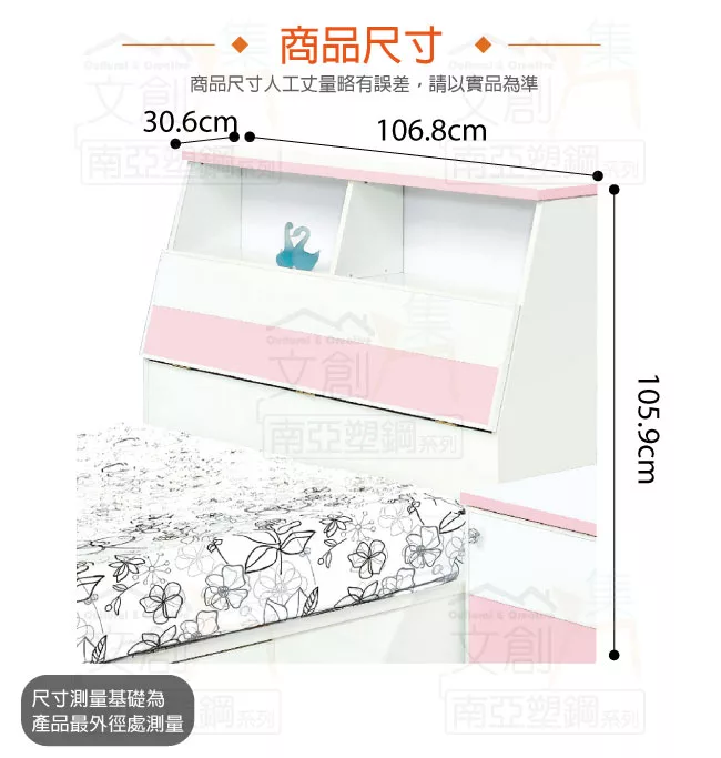 【文創集】雪莉 環保3.5尺單人南亞塑鋼床頭箱(不含床底&不含床墊) 產品採用第一品牌-台製南亞塑鋼舒美板材質,整體材質採用防水+防燃+無甲醛安心塑鋼材質製造 ,床頭箱為可掀式床枕板+內收納層格收納設計,防止受潮,增加支撐力,堅固不會塌陷,全由專人配送到家,專業安心服務,替你省下更多時間!