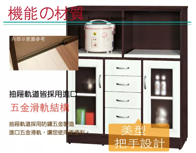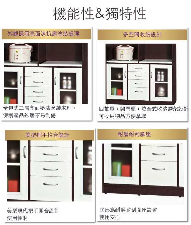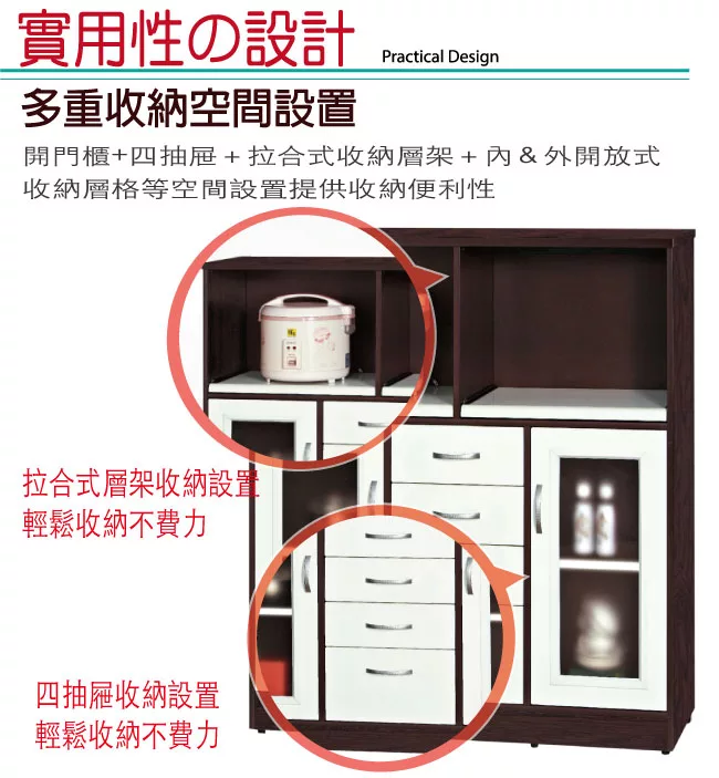 開門櫃+四抽屜+內&外開放式層格+拉合式層架等便利收納空間設計