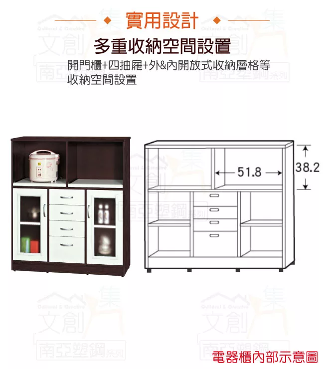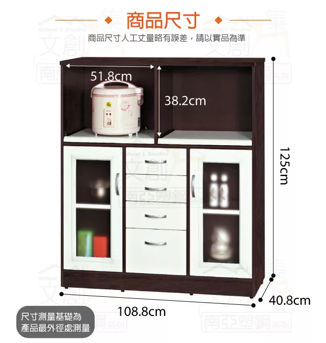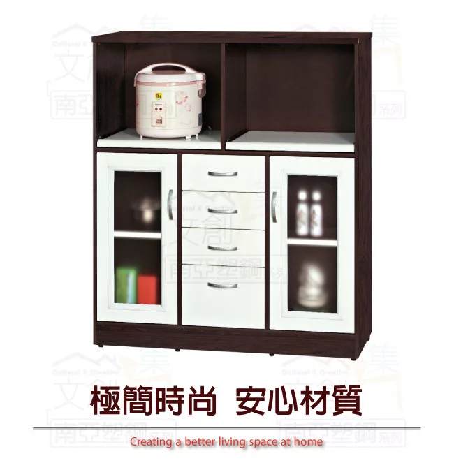 【文創集】尼爾 環保3.6尺南亞塑鋼二門四抽餐櫃/收納櫃 產品採用第一品牌-台製南亞塑鋼舒美板+五金滑軌結構材質,整體材質採用防水+防燃+無甲醛安心塑鋼材質製造 ,搭配開門櫃+四抽屜+內&外開放式層格+拉合式層架等便利收納空間設計,防止受潮,增加支撐力,堅固不會塌陷,全由專人配送到家,專業安心服務,替你省下更多時間!