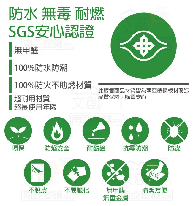 防水+防燃+無甲醛安心塑鋼材質,結構牢固耐用,也不用擔心蟲蛀的煩惱,使用放心