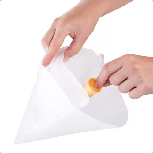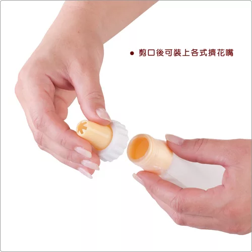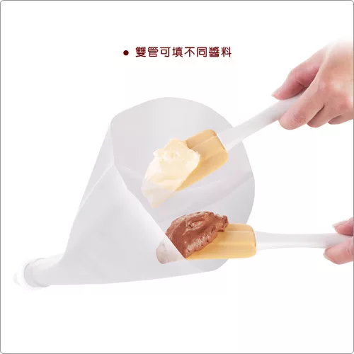 本商品一件入、適用手洗清潔、冷藏冷凍、適合融化的液態巧克力醬 (約 32~48 度C)、奶油醬、麵糊等,請勿直接加熱使用或填裝過熱液體;使用時可依袋身裁剪圖示剪口套用花嘴轉接頭 (亦可免裁剪直接擠花)。悠閒的下午就來做點心吧,看著熱騰騰的蛋糕出爐,心情都好起來了,使用時可將不同色彩的奶油、果醬、巧克力醬填充在雙管擠花袋中,裝飾蛋糕,或製作花式餅乾,讓點心豐富更繽紛。大容量擠花袋,剪口後可裝上各式擠花嘴,讓您輕鬆完成泡芙內餡充填與甜點擠花裝飾。彈性材質好裝填醬料,清洗後可重複使用,內裏不沾設計易於清潔,外表面止滑設計能在擠壓時,使您不滑手,給您更方便的使用經驗。可吊掛收納省空間。
