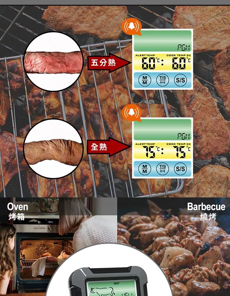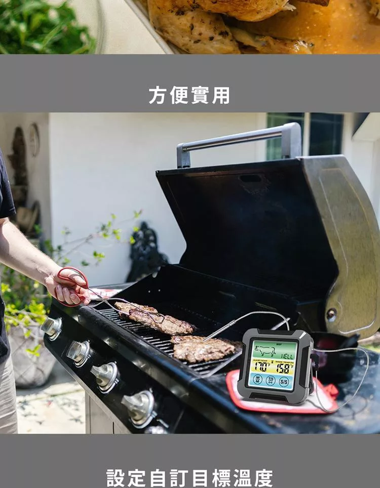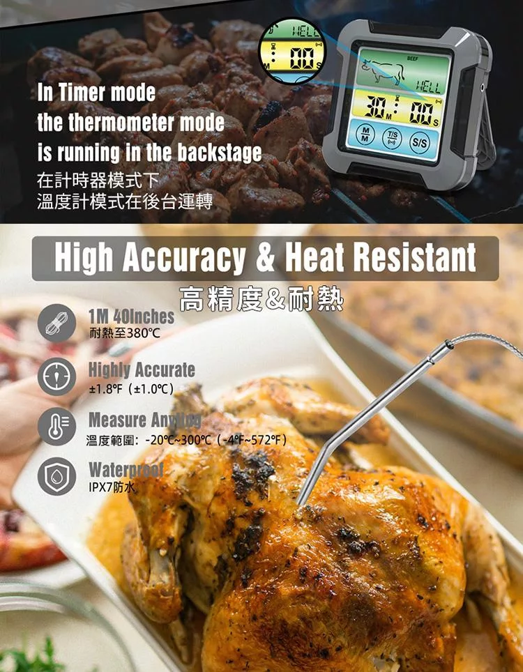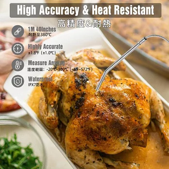 2.探針適合與烤箱、瓦斯爐、炸鍋或戶外燒烤料理時搭配使用(不適用微波);請勿接觸直接熱源。探針連接線使用過可能因高溫燙手,請搭配隔熱手套使用。