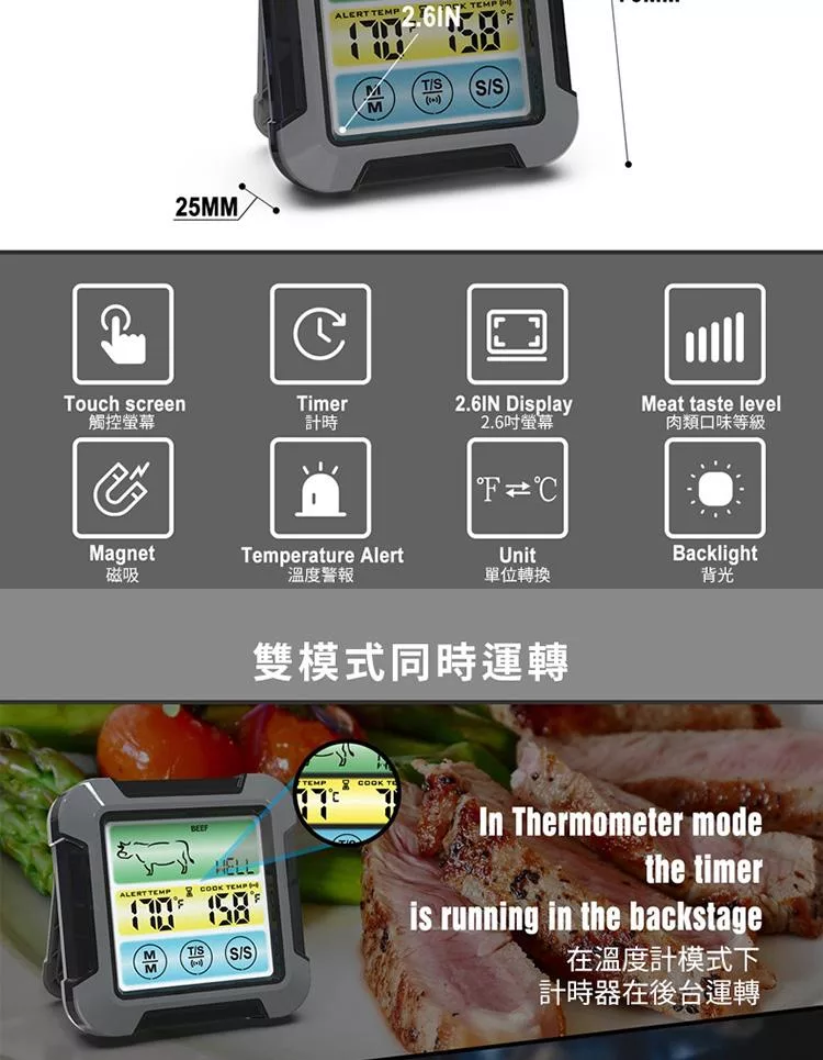 溫度警報、計時、單位切換、背光