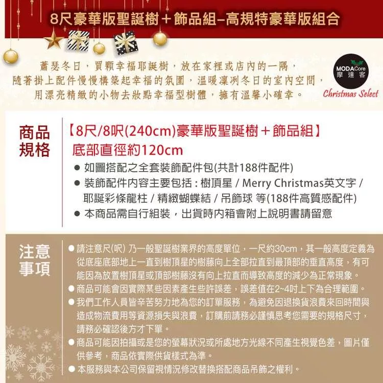 摩達客台灣製8尺(240cm)豪華型裝飾綠色聖誕樹-全套飾品組不含燈(可選款)-歐美耶誕外銷人氣款 檳金白大雪花金果球系