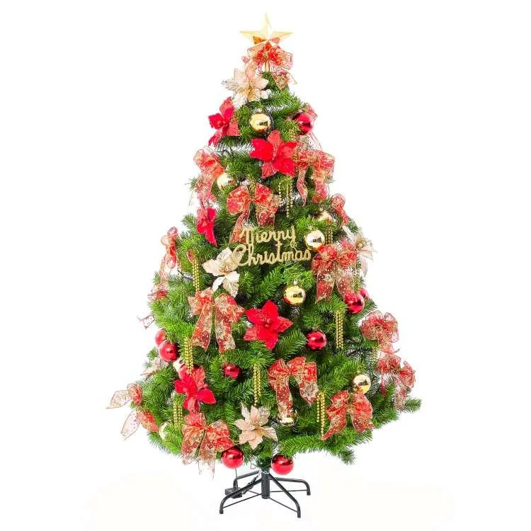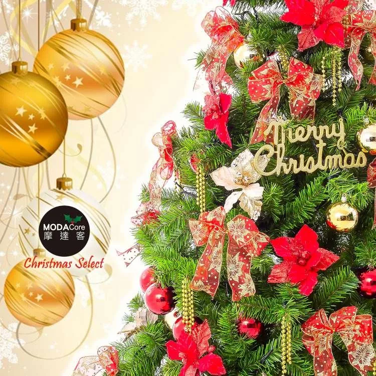 摩達客台灣製8尺(240cm)豪華型裝飾綠色聖誕樹-全套飾品組不含燈(可選款)-歐美耶誕外銷人氣款 火焰金白大雪花紅果球系