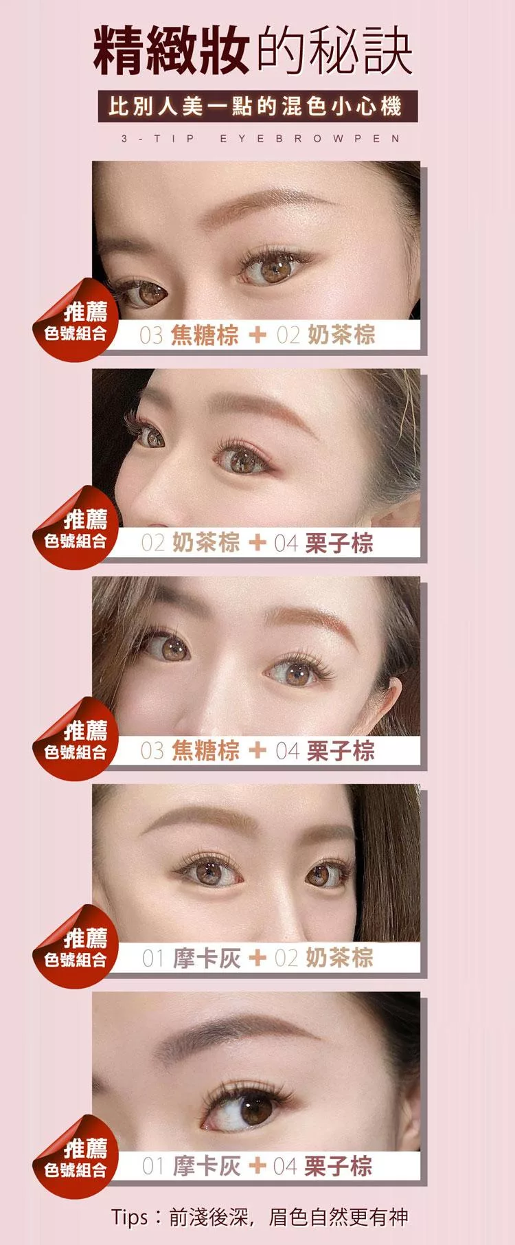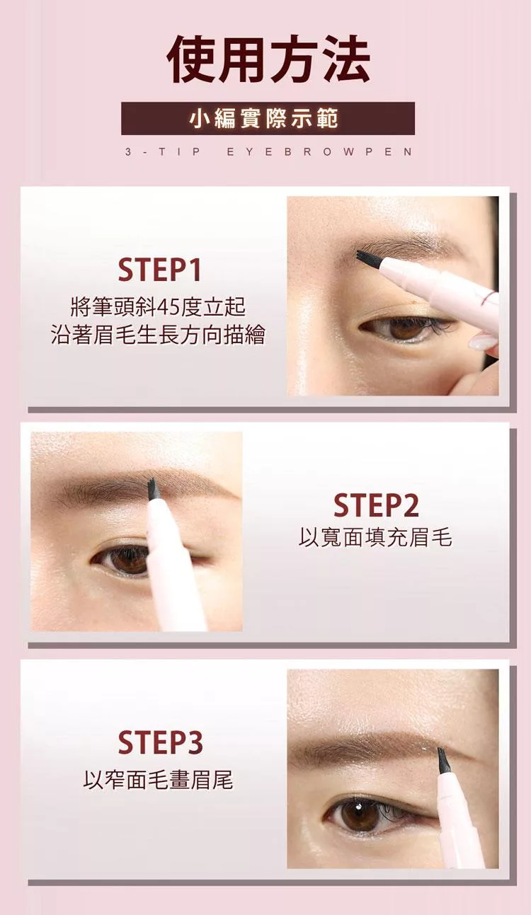 【使用方法】將筆頭斜45度立起,沿著眉毛生長方向描繪,以寬面填充眉毛,以窄面描畫眉尾。