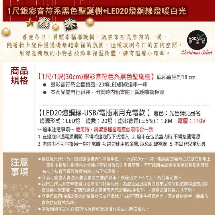 摩達客-台灣製1尺30cm精緻綠色聖誕樹+聖誕花金系裝飾品組_免組裝+20燈LED銅線燈串暖白光-USB電池盒兩用