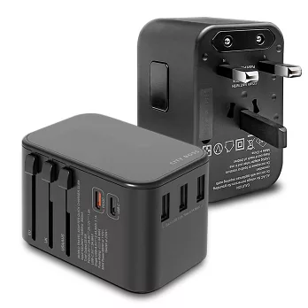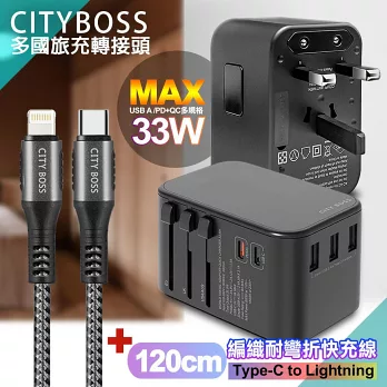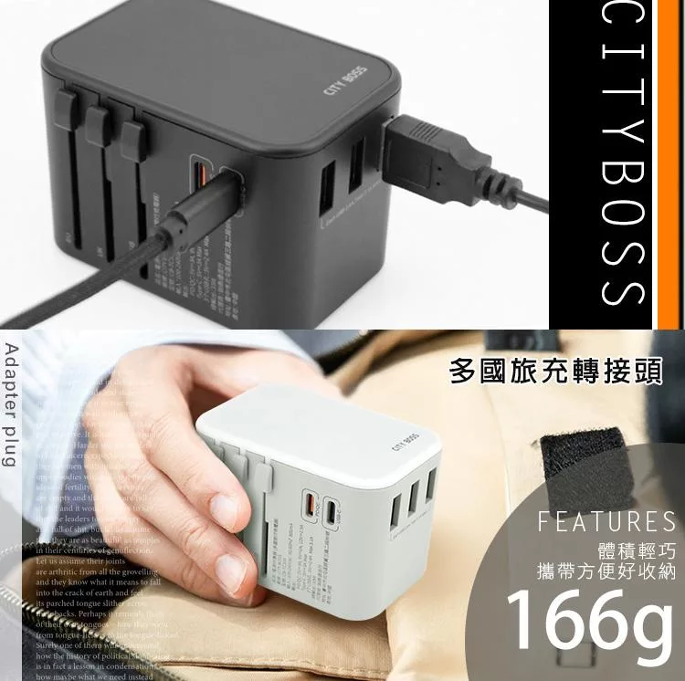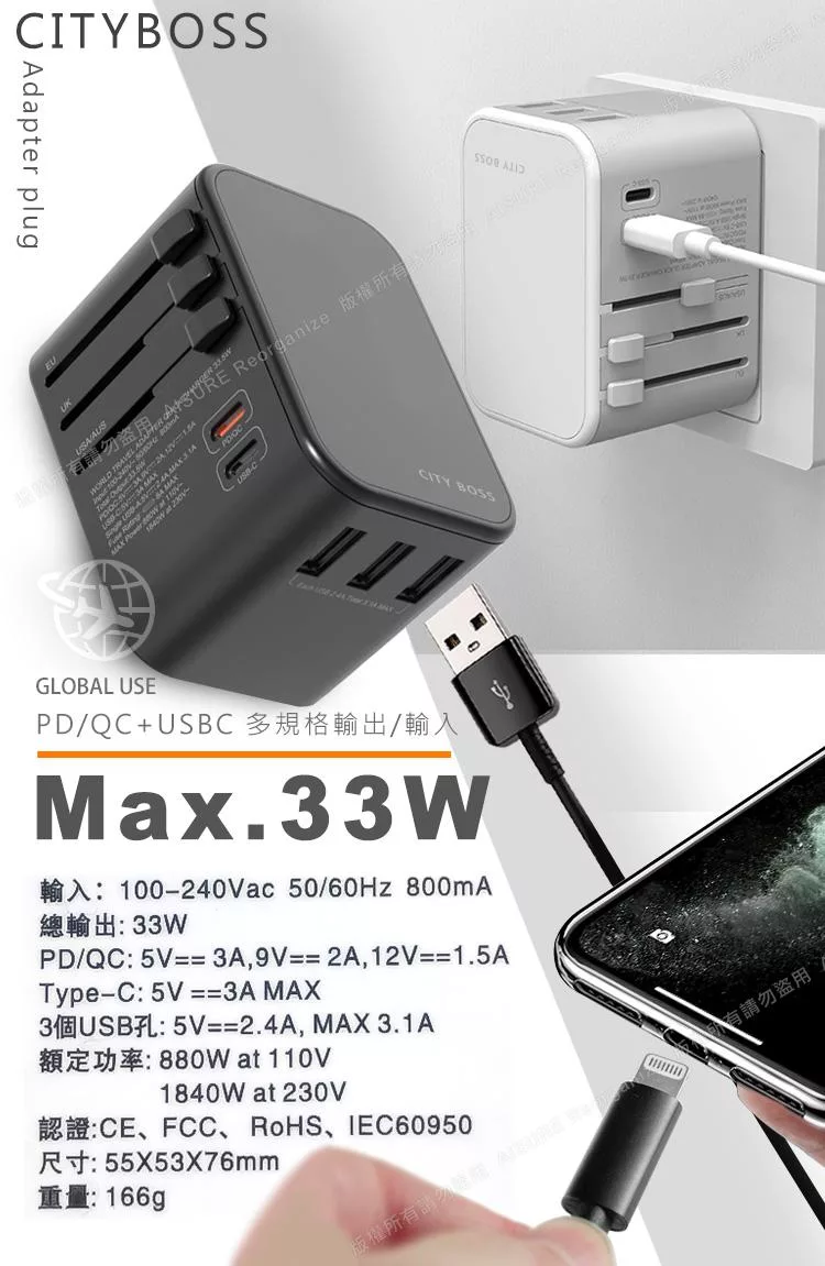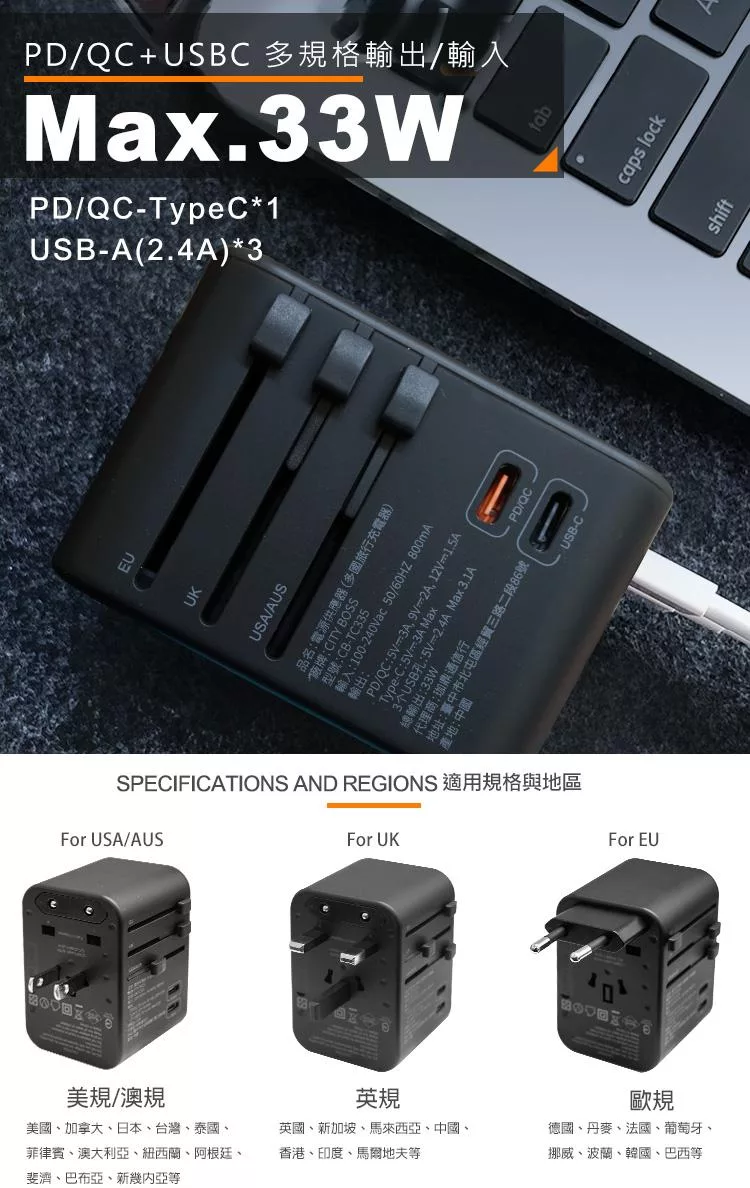 CITY 33W 出國萬用充電器 全球通用萬能轉換插頭(2USB-C+3USB-A ) 商務黑