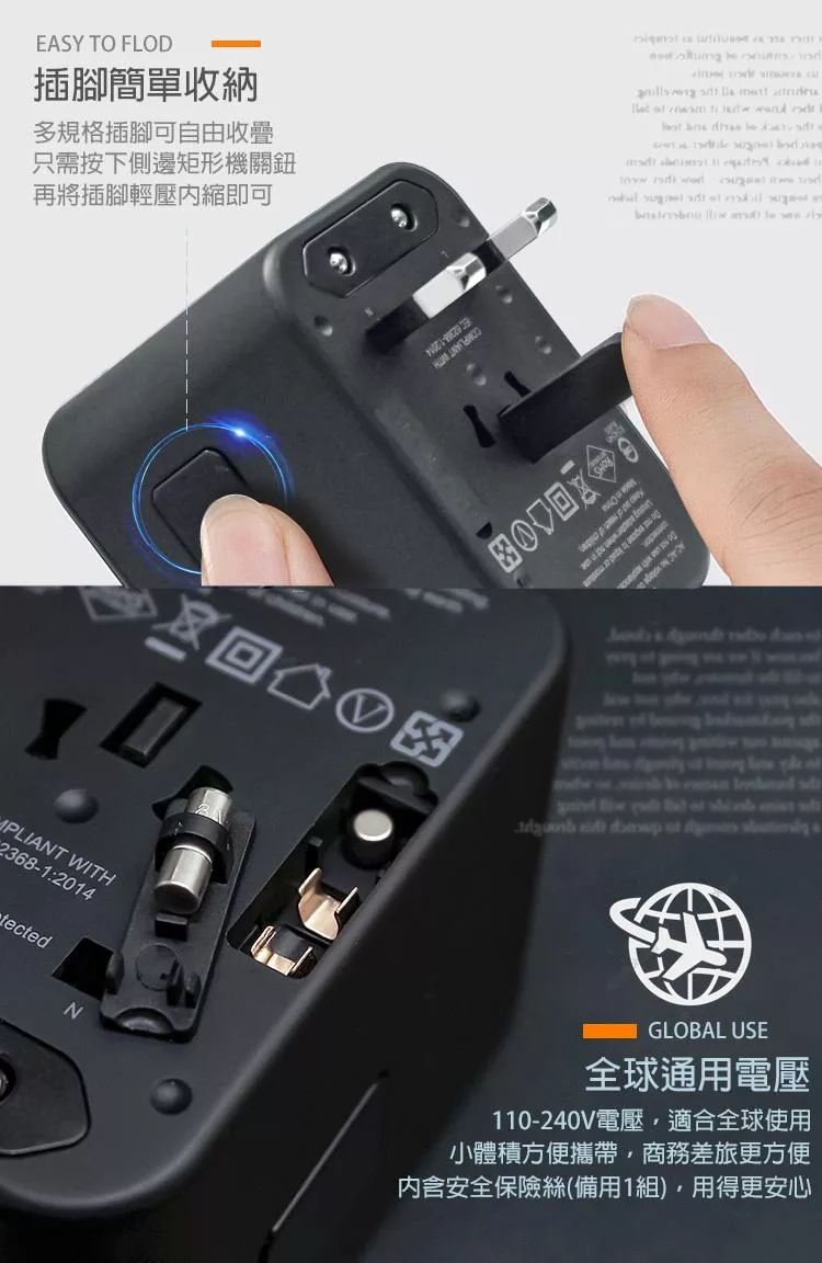 POLYBATT 萬國旅行轉接頭 35W氮化鎵GaN 自帶伸縮線USB充電器 3種國際規格 黑色