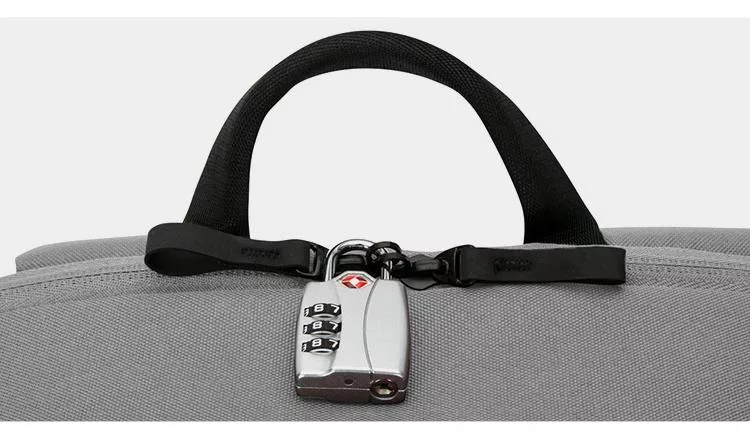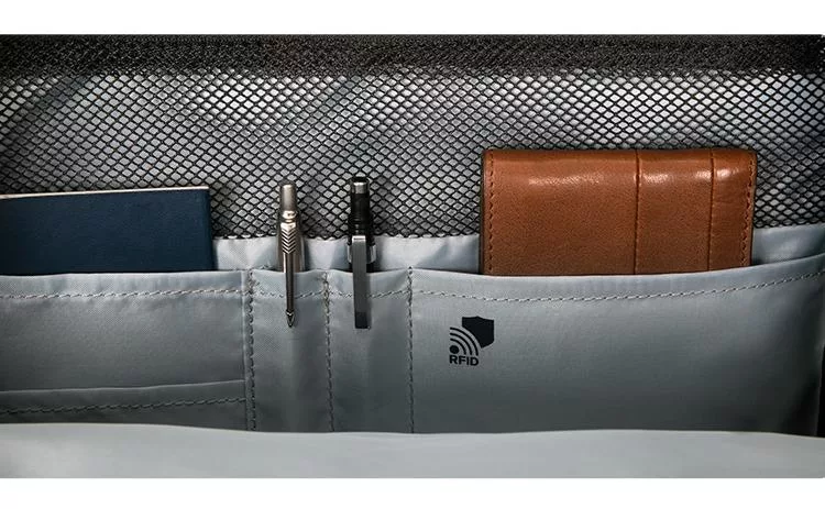 帶襯墊的筆記型電腦隔層,採用安全可鎖拉鍊 ( 可另購旅行密碼鎖 ) ,方便取用。寬敞的主隔層,內部設有一個方便的文具收納層,可將必備的筆、筆記本和卡片等都依序放入,配有 RFID 防盜口袋,適合放置護照、錢包的好地方,以防個資盜取,盡情享受旅行。