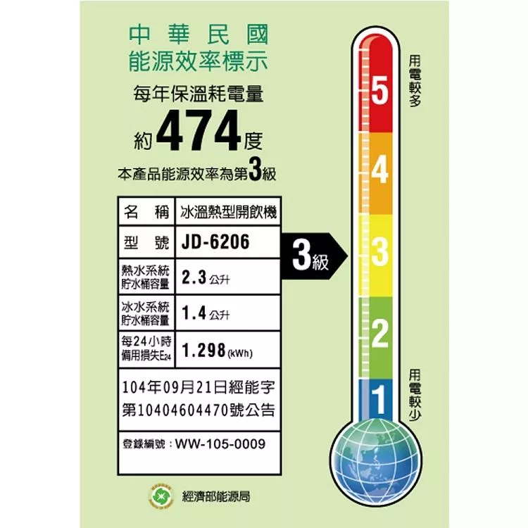 【晶工牌】冰溫熱開飲機(JD-6206 節能)