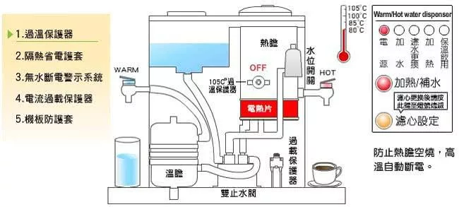 *自動加熱:生水進入熱膽,感測水位後,自動加熱至開水狀態