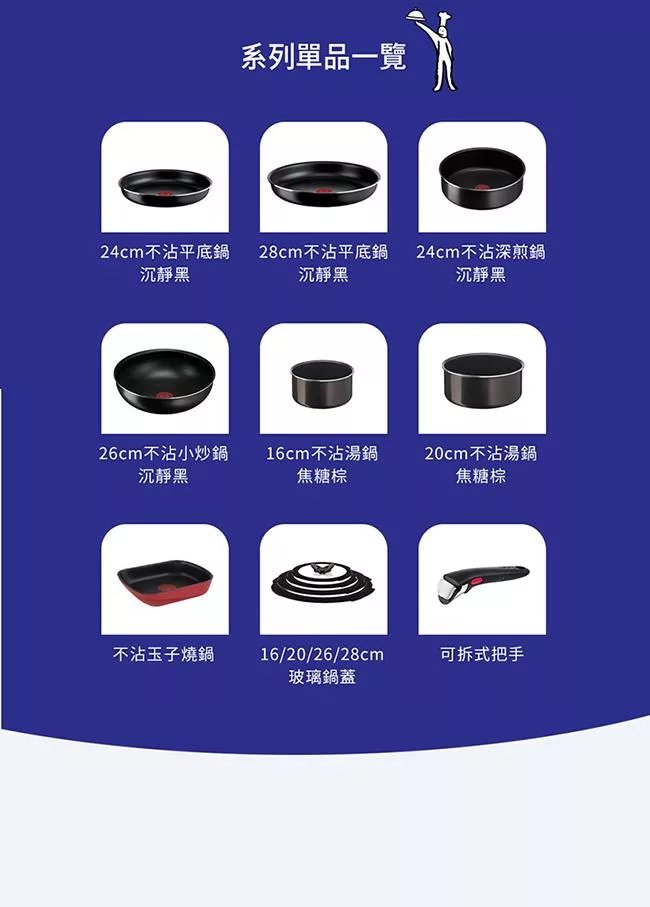 Tefal法國特福巧變精靈系列提供各式套組、不同尺寸鍋型及零件之單品,可自由挑選組合,堆疊收納不佔空間,最適合小家庭、小廚房、單身貴族或戶外露營使用,無論是料理新手或廚藝達人,讓您愛怎麼煮就怎麼組!