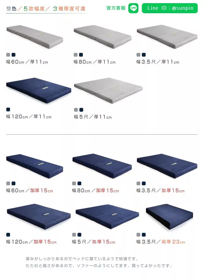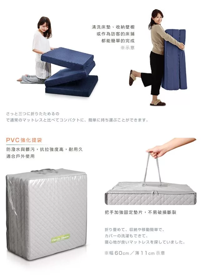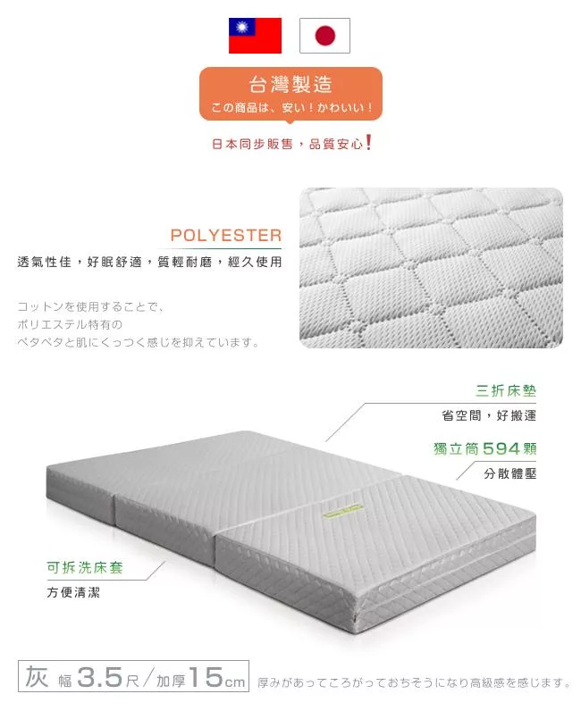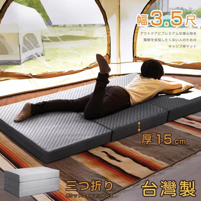 台灣製造,日本同步販售,品質安心。三折設計,方便展開與折疊床墊,快速簡單便可佈置完成。床墊厚度15cm,加厚設計,省空間好收納。對於家裡的臥房、客房、兒童房來說,展開就是一張床,折疊起來就是一個座墊。POLYESTER 布料透氣性佳,好睡舒適,質輕耐磨,經久使用。依據 CNS 7447 國家標準,72B 鋼線獨立筒,具備韌性佳、結構強、耐用久,用於獨立筒床墊是最舒適的硬度。獨立的彈簧,分散體壓,各別配合身形而下沉,保持自然的睡姿,減輕骨骼的壓力。可拆洗床套便於清潔,避免塵蟎、細菌或過敏原滋生。