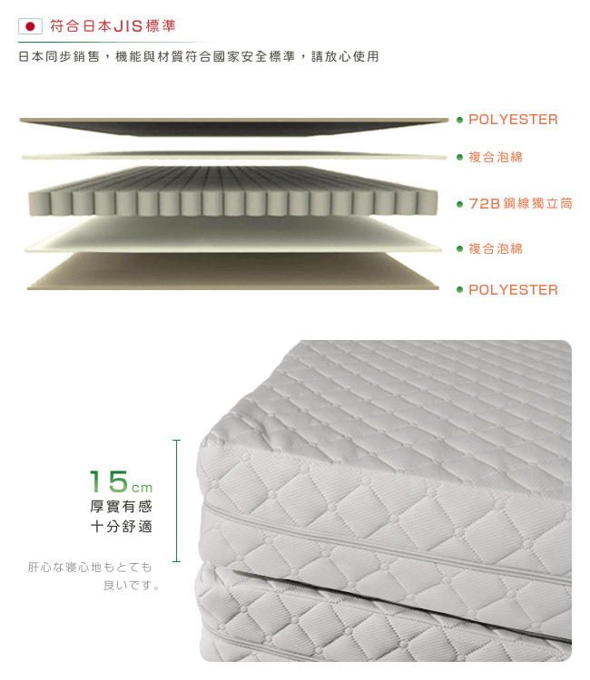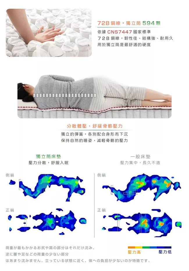 材質:POLYESTER、中空網布、複合泡綿、72B 鋼線獨立筒 594 個
