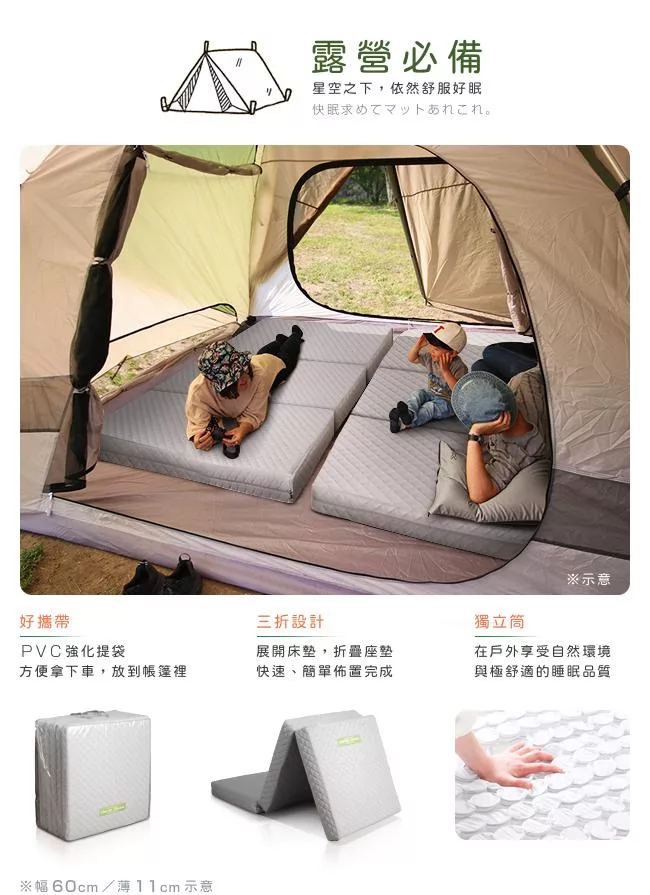 假日與親朋好友愉快的開車出遊、野外露營,充實度過了一整日後,不用再困擾睡覺的地方是否舒適、擔心睡不好,讓隔天玩得不盡興。【C'est Chic】二代目日式三折獨立筒彈簧床墊3.5尺(加厚),好攜帶、省空間,輕鬆展開便是一張床墊。出門在外,也能享受到獨立筒帶來的良好睡眠品質。在車內使用的話,瞬間成為膠囊旅館,讓露營更加簡單不麻煩。貼心附贈 PVC 強化提袋,防潑水與髒污,專為戶外攜帶使用而設計。