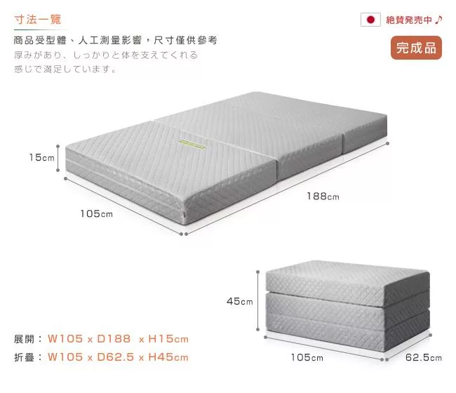 產品尺寸:展開W105*D188*H15 cm;折疊W105*D62.5*H45 cm