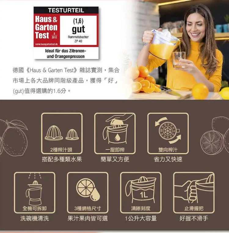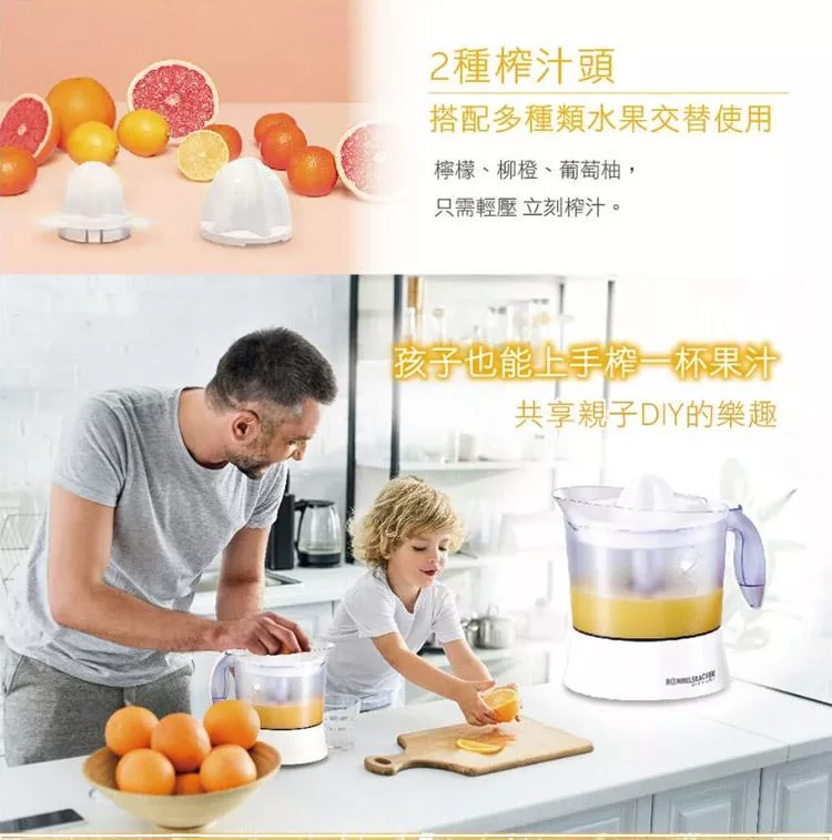 2種不同尺寸的錐形榨汁頭,可依照不同的水果大小交替使用,不論是檸檬、柳橙或葡萄柚,只需要輕輕一壓就啟動,