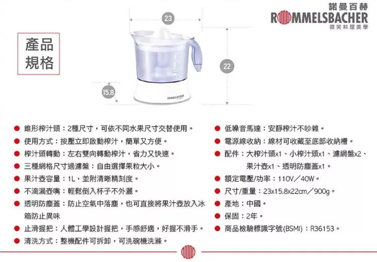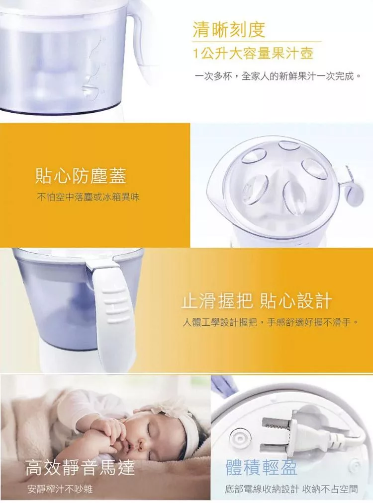 配件:大榨汁頭x1、小榨汁頭x1、濾網盤x2、果汁壺x1、透明防塵蓋x1