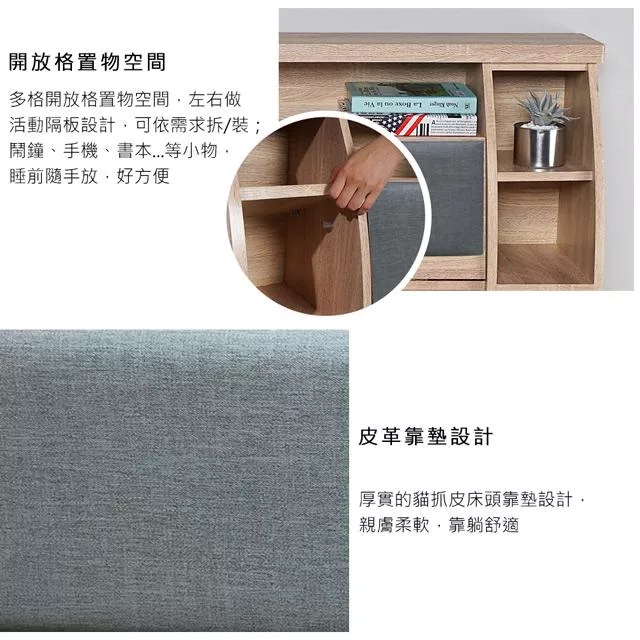 IDEA-米森質感貓抓皮5尺標準雙人床架三件組(床頭片+床底+床頭櫃) 淺灰色款