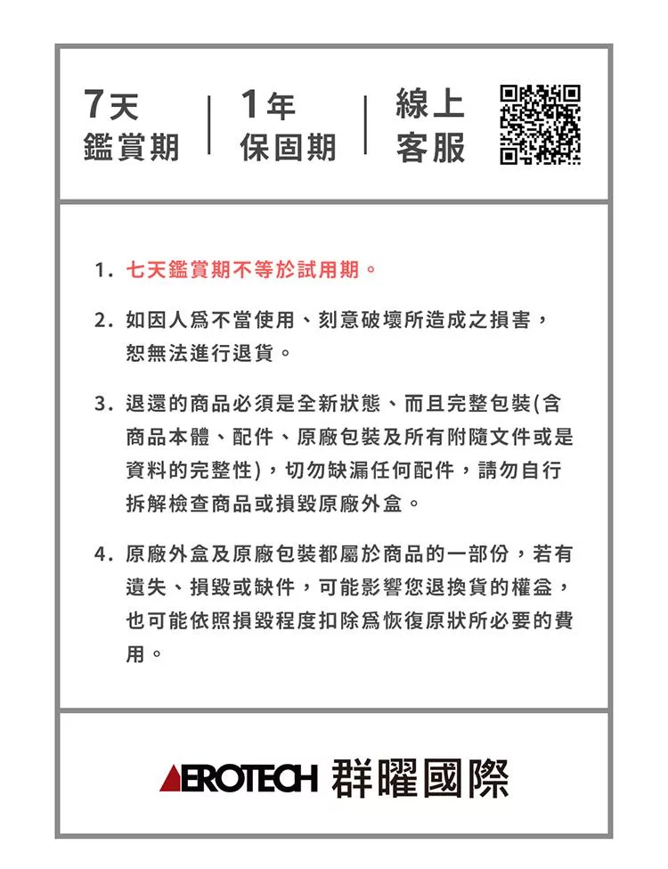 商品必須是全新狀態與完整包裝(請注意保持商品本體、配件、贈品、保證書、原廠包裝及所有附隨文件或資料的完整性,切勿缺漏任何配件或損毀原廠外盒),否則將可能視回收的商品及包裝之破壞狀態(如損傷、缺件、不當使用) 計算商品價值之損失,酌收額外的回復原狀費用,請您務必確認有購買需求後再行拆封,感謝您的配合。