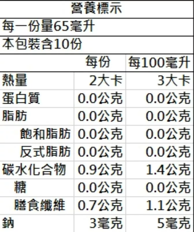 • 【每份營養成份】蛋白質0.0公克、脂肪0.0公克、飽和脂肪0.0公克、反式脂肪0.0公克、碳水化合物0.9公克、糖0.0公克、膳食纖維0.7公克、鈉3毫克
