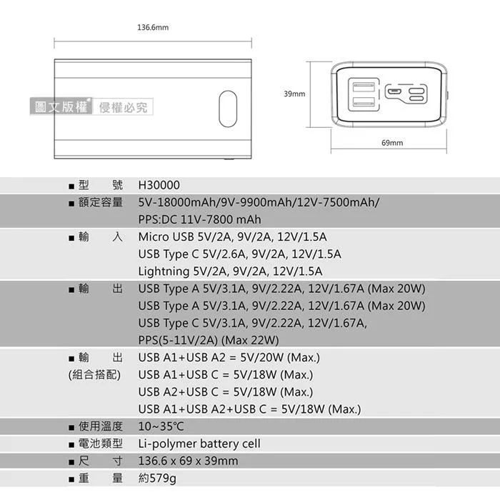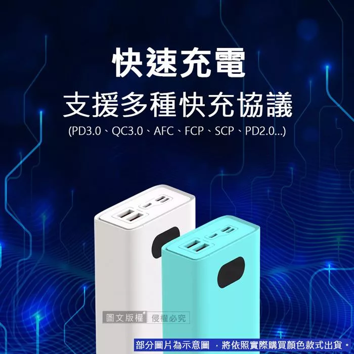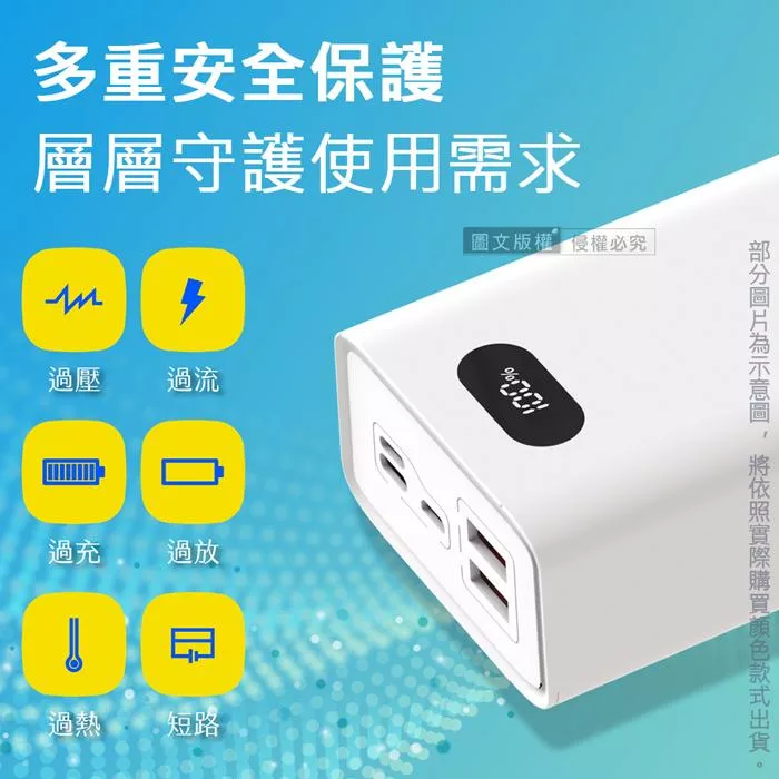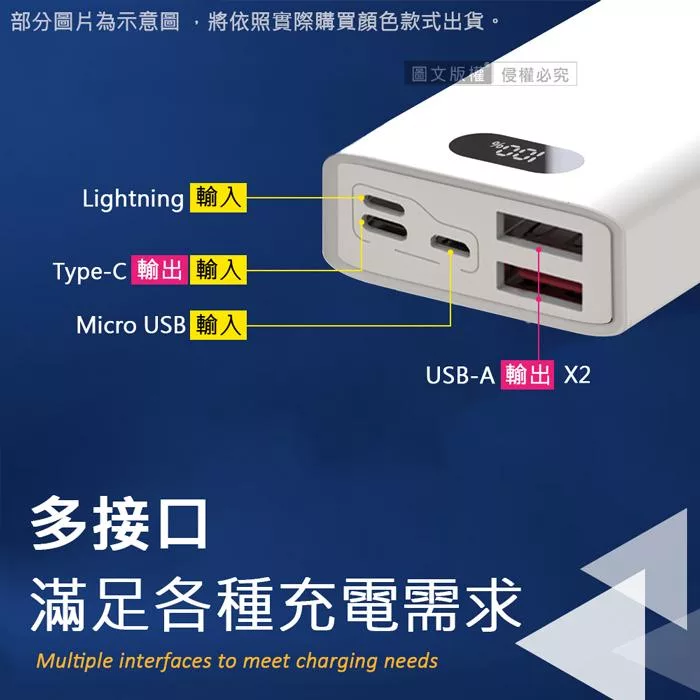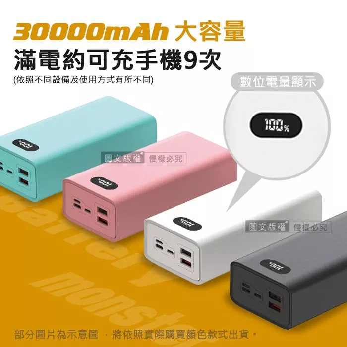 ▼三孔同時輸出,一起充沒問題▼ .支援多項快充協議,兼容多款手機 .30000mAh超大容量 .LED數位顯示,掌握電量好方便 .台灣製造,安心有保障 .繽紛多色,任挑任選 -------- MIT台灣製 LED數位顯示 PD+QC+PPS 22W雙向快充行動電源 H30000