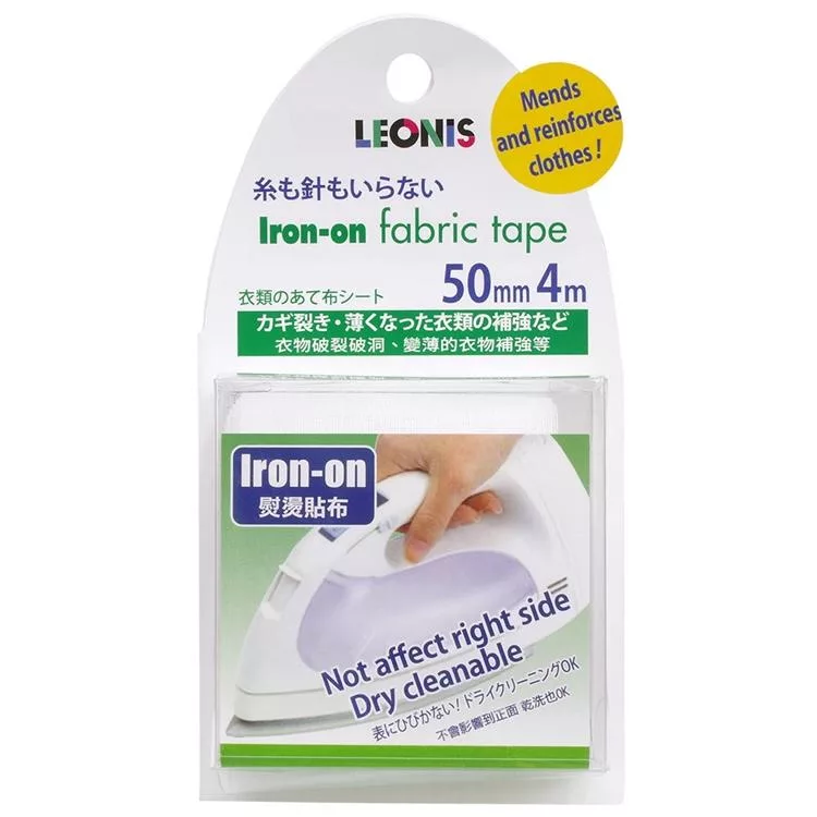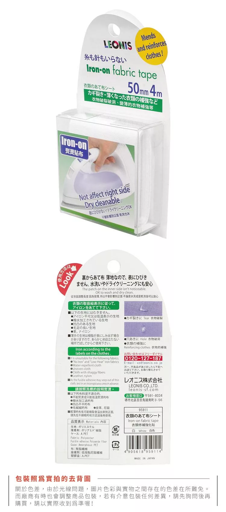 ●【品名】日本LEONIS免車縫修補衣服褲裙強化用熨燙貼布95911白色(寬5公分x長4米;適衣褲裙平面部分)燙斗布貼布膠帶膠布