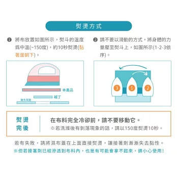 ●失敗後,想要取下布貼的話,假如接著劑已經滲透到布料內,也是有可能會拿不起來,請小心使用!