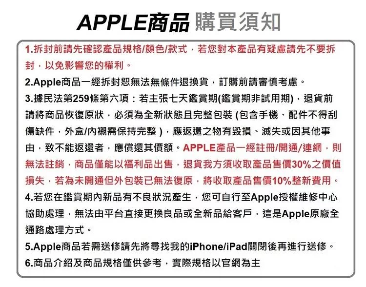 2.商品開箱後若有瑕疵 / 不良,需由消費者帶至授權中心進行維修流程,需依 APPLE 原廠規範判定後提供更換或是維修處置。