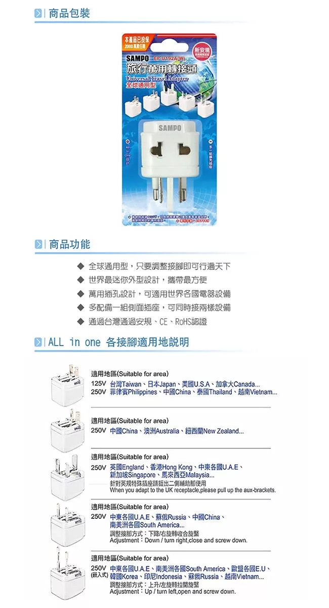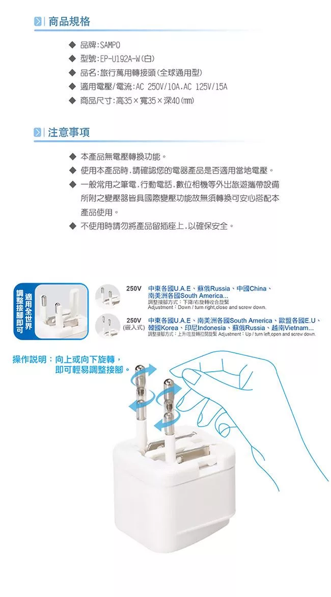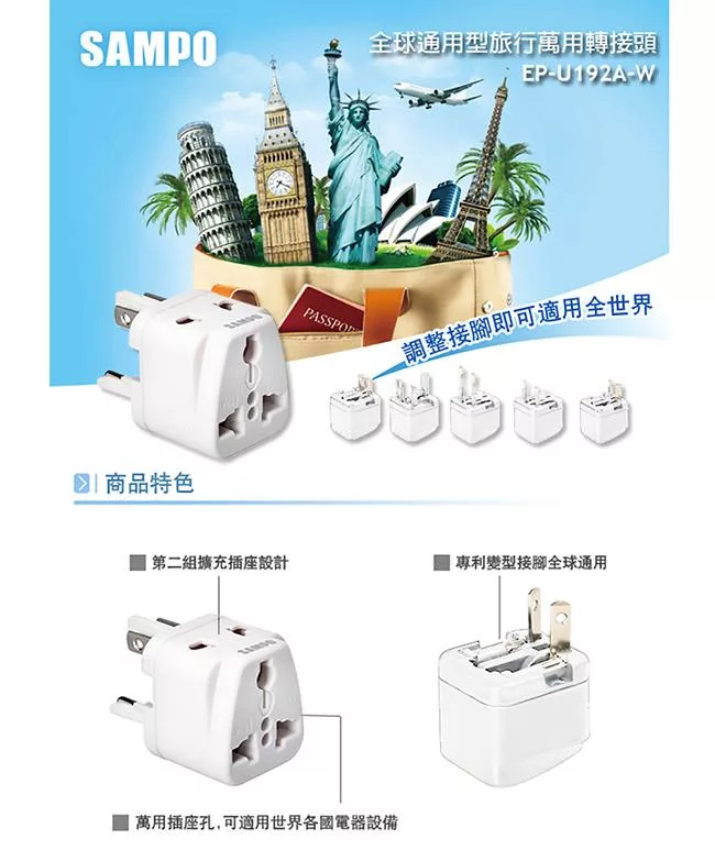 聲寶 EP-U192A-W 旅行萬用轉接頭(全球通用型) 2入