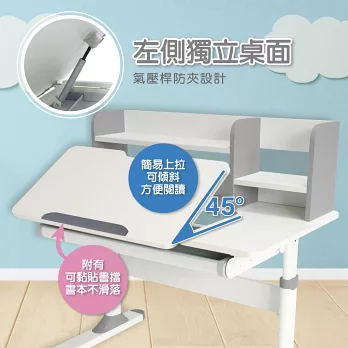 簡易上拉可以傾斜45度方便閱讀,桌面附有可黏貼書擋書本不滑落,右側獨立桌面空間可供家長伴讀,