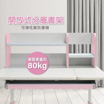 桌面亦可承重平均受力約80公斤,開放式分層書架可彈性擺放書籍,左側為氣壓桿防夾設計獨立桌面,
